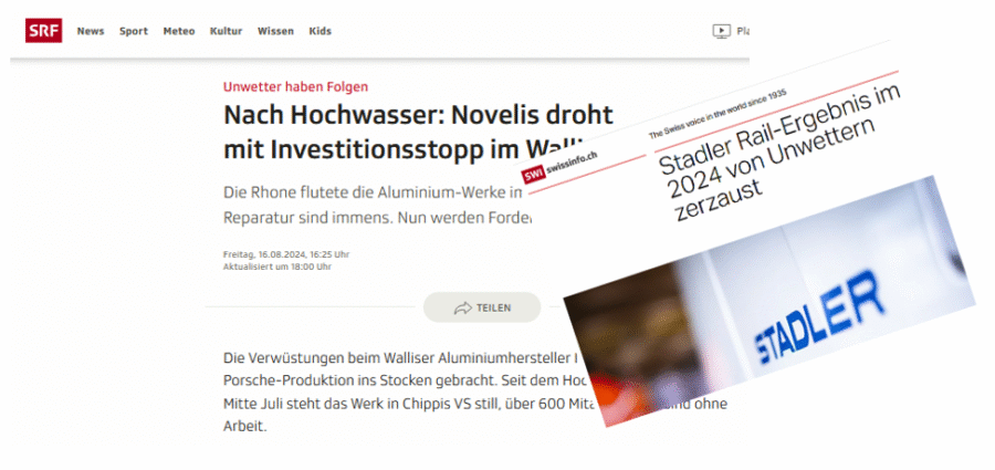 Le changement climatique a déjà un impact sur nos emplois. Un exemple : les inondations en Valais en 2024 ont également inondé l’usine d’aluminium Novelis à Sierre, l’activité a été suspendue pendant des semaines. Cela a notamment entraîné une pénurie d’aluminium et, par conséquent, du chômage partiel chez Stadler Rail.
